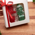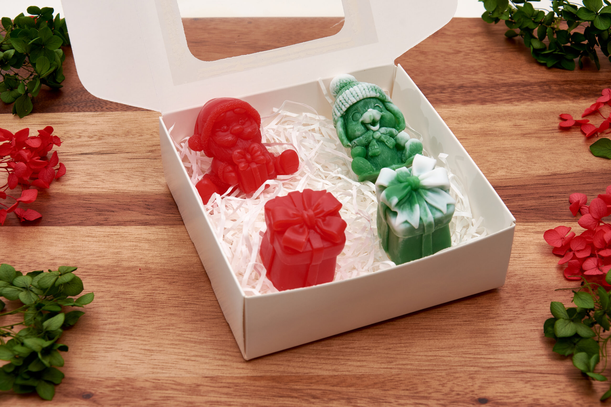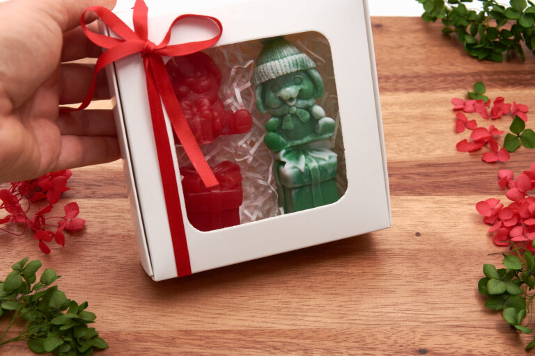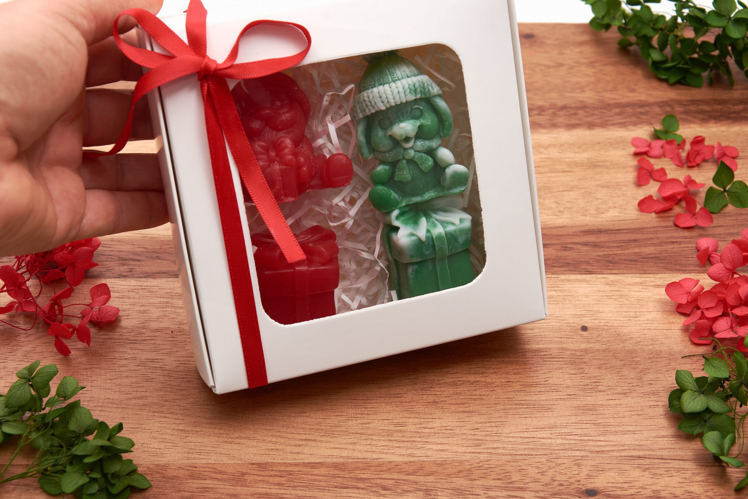 2 gift-shaped soaps decorated with elegant bows (red and green with white)